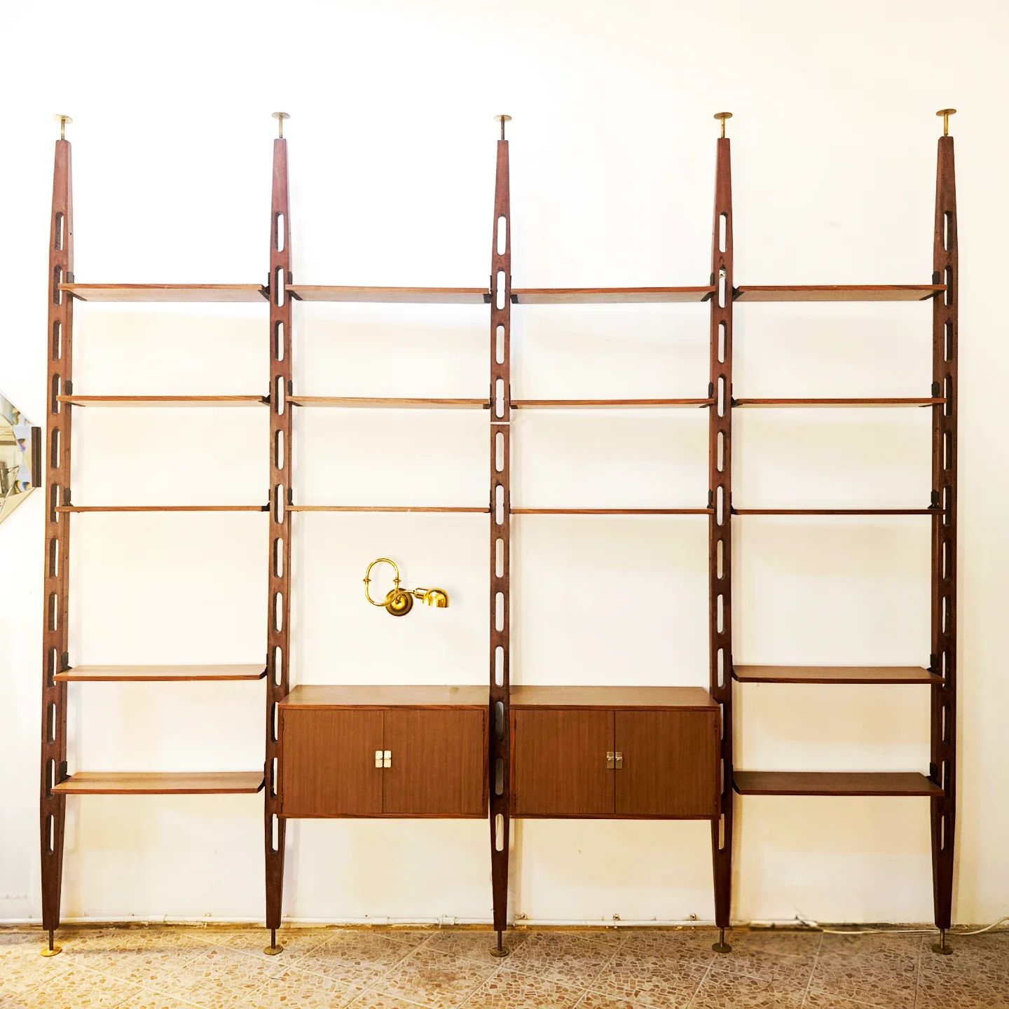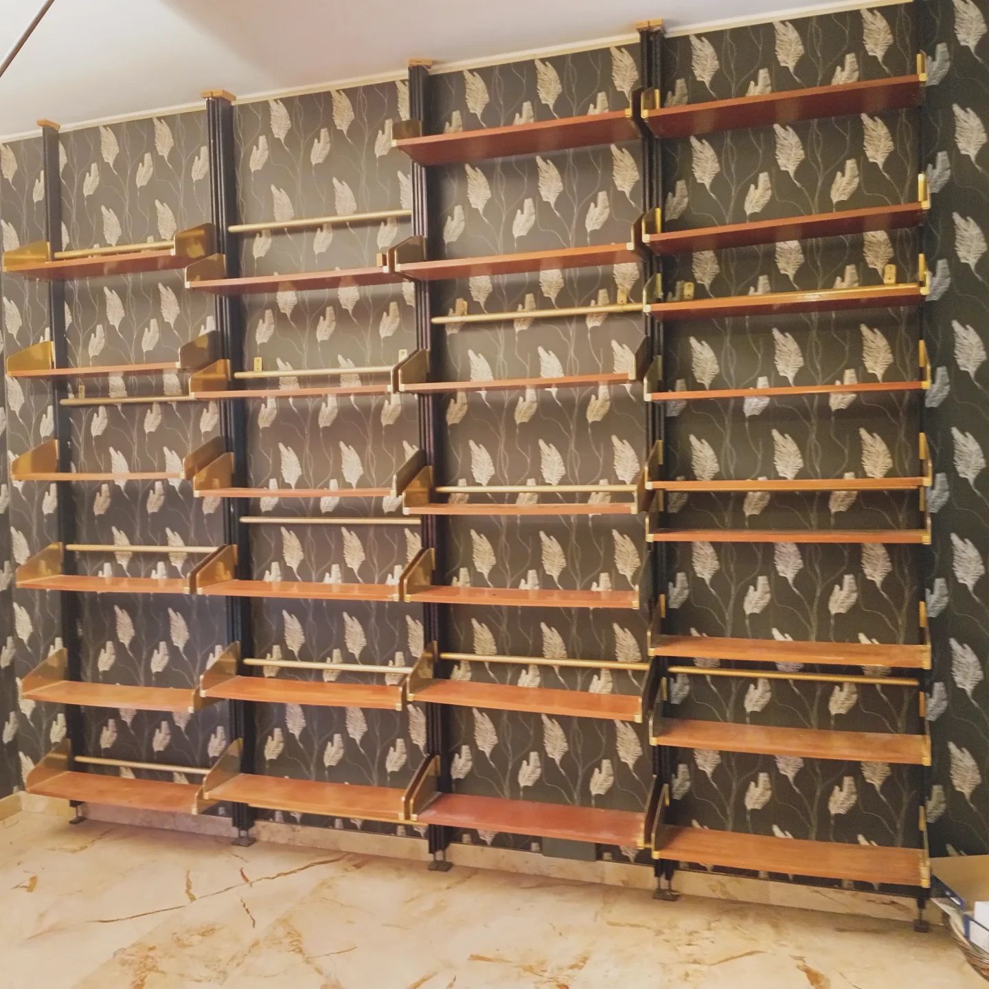 ButtonLibreria FEAL con otto ripiani in alluminio laccato nero, alluminio dorato e legno.